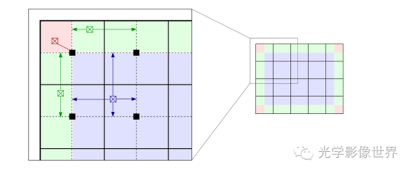插值过程,得到了CDF函数,也就获得了对应的亮度变换函数,在计算变换函数的时候可以通过插值过程来降低计算量。其中红色块(图像角点处)的变换函数是完全按照定义获得的,绿色块(图像边缘)的变换函数是通过旁边两个图像块的变换函数线性插值得到的,蓝色部分图像块的变换函数则是通过双线性插值得到。
