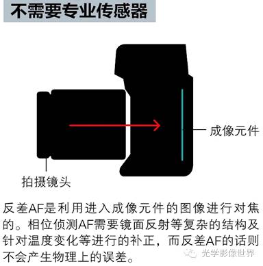 反差对焦将对焦传感器、半反射镜取消了,由此引发的光路长度变化等顾虑也就没有了,因此也提高了对焦成功率。