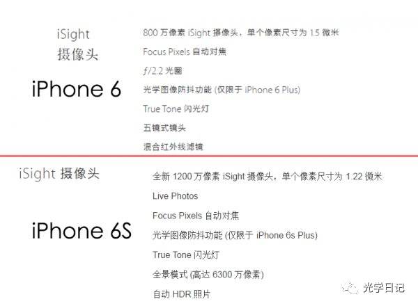知道你们喜欢对比,这次就挑选了好不容易终于从800 万像素升级到 1200 万像素的 iPhone6s 和 iPhone6 做对比,由于 iPhone 6S 的传感器面积并没有增加而只是增大了镜头像素,根据上面的解释我们可以得知 iPhone 6S 的单位像素面积肯定会比 iPhone 6 上面的单位像素面积要小。而事实上官方文件也是这样写明的,iPhone6 的单位像素面积是 1.5 μm,而新的 iPhone 6S单位像素面积则是 1.22 μm。
